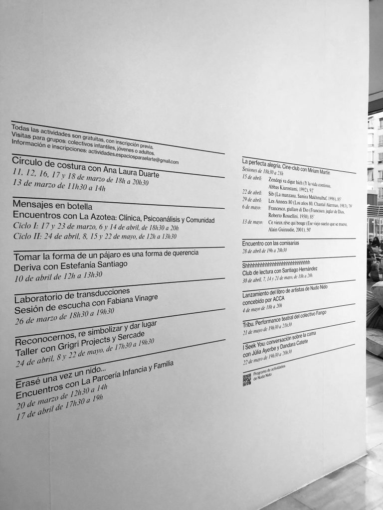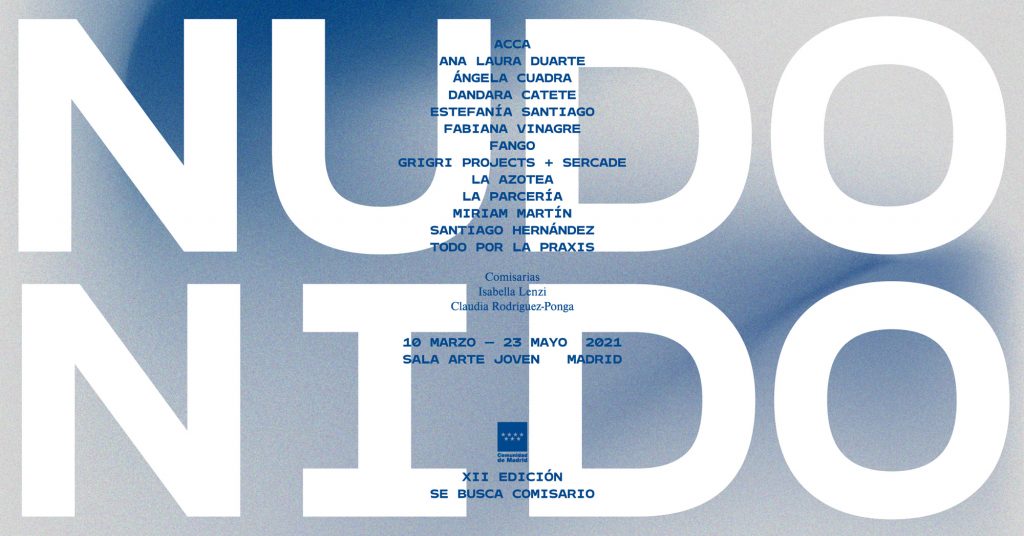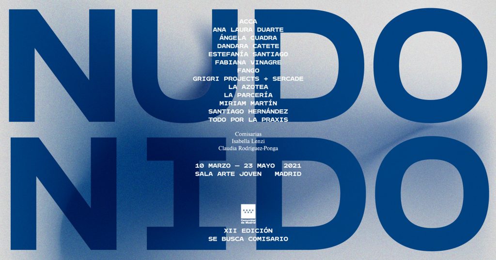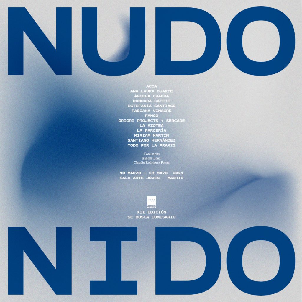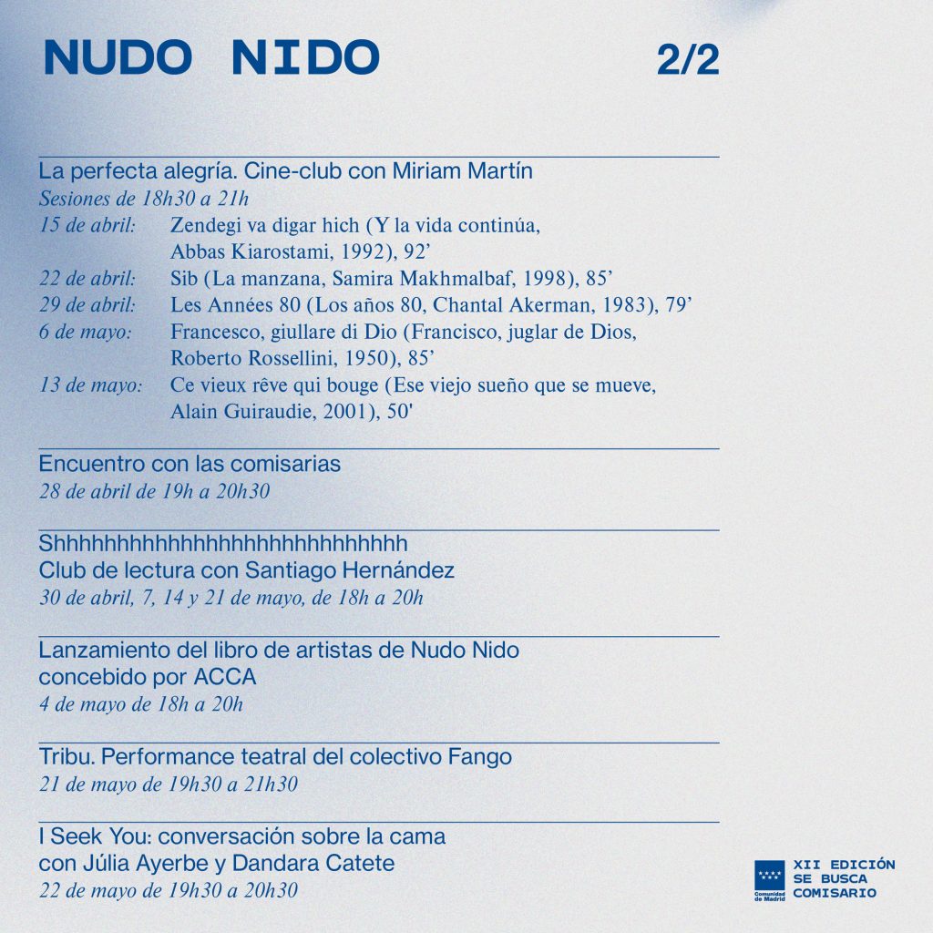Nudo Nido, public activities programme and exhibition project anchored around collaborative practices and interwoven experiences, curated by Isabella Lenzi and Claudia Rodríguez-Ponga at Sala Arte Joven Madrid, Se busca comisario XII, Comunidad de Madrid, ES, 2021.