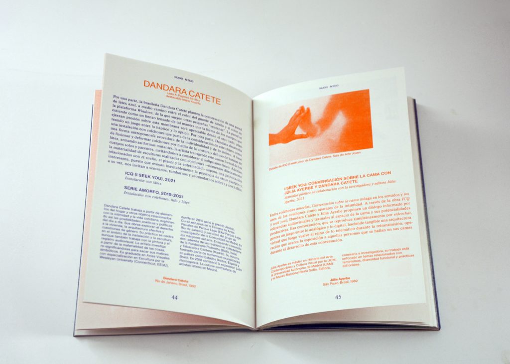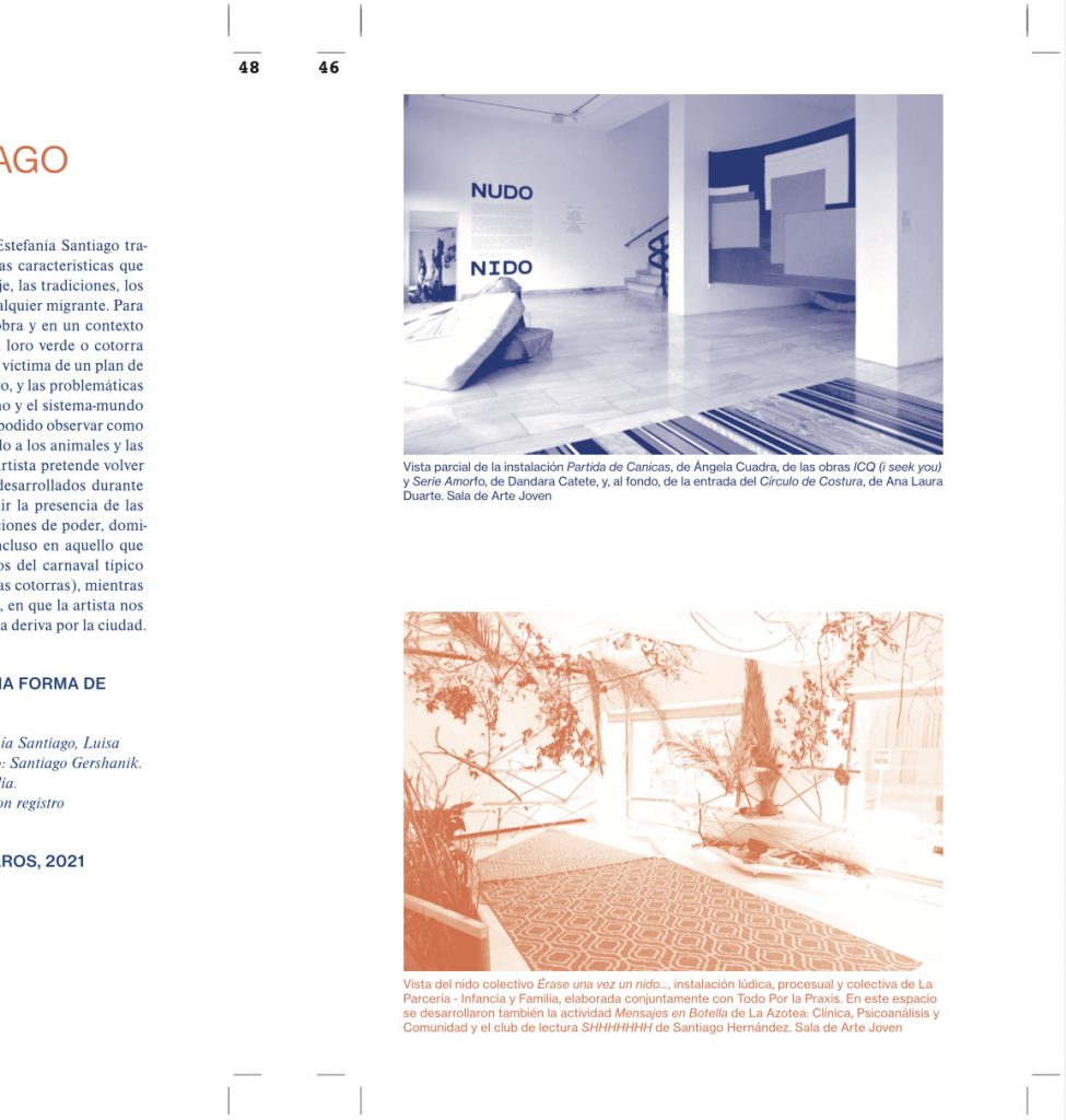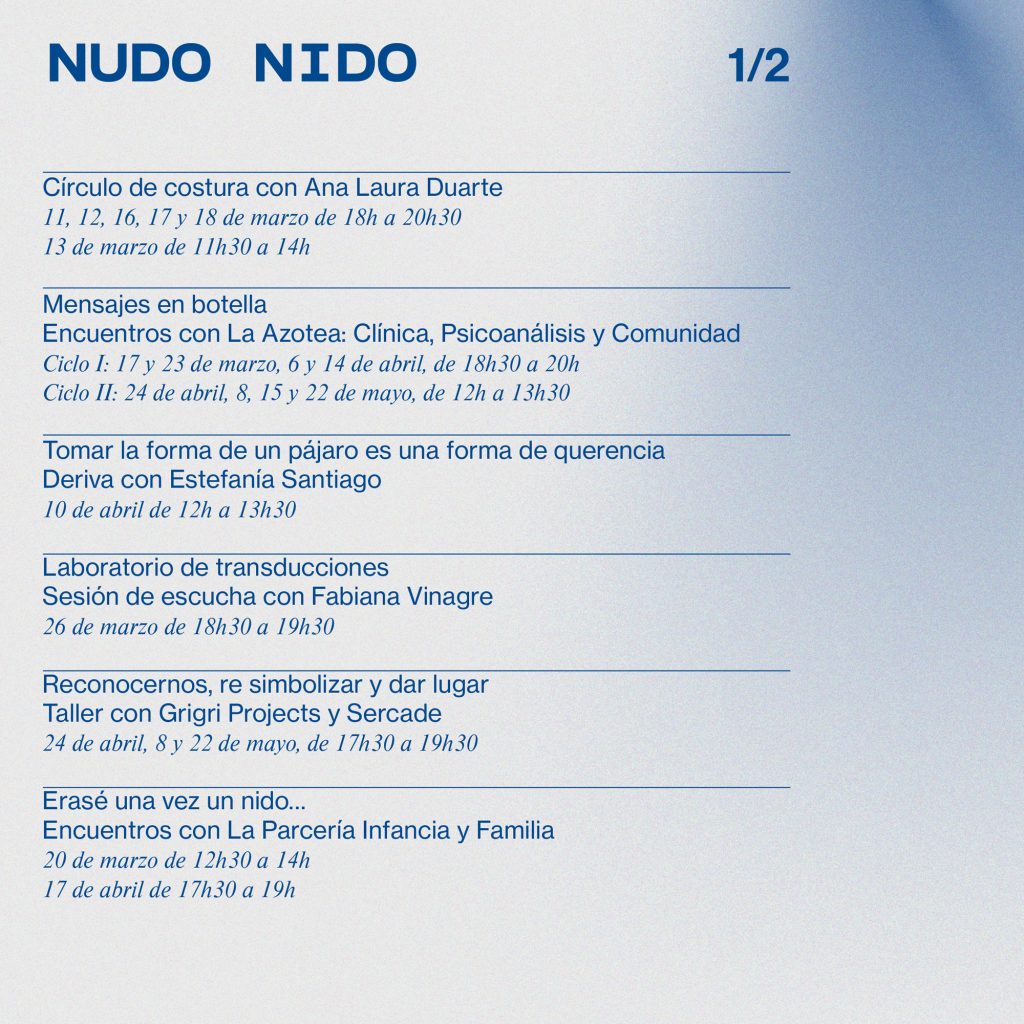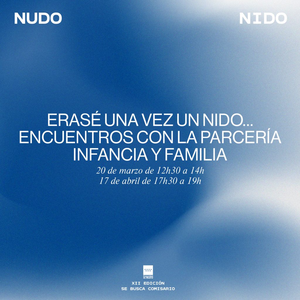 Nudo Nido, public activities programme and exhibition project anchored around collaborative practices and interwoven experiences, curated by Isabella Lenzi and Claudia Rodríguez-Ponga at Sala Arte Joven Madrid, Se busca comisario XII, Comunidad de Madrid, ES, 2021.