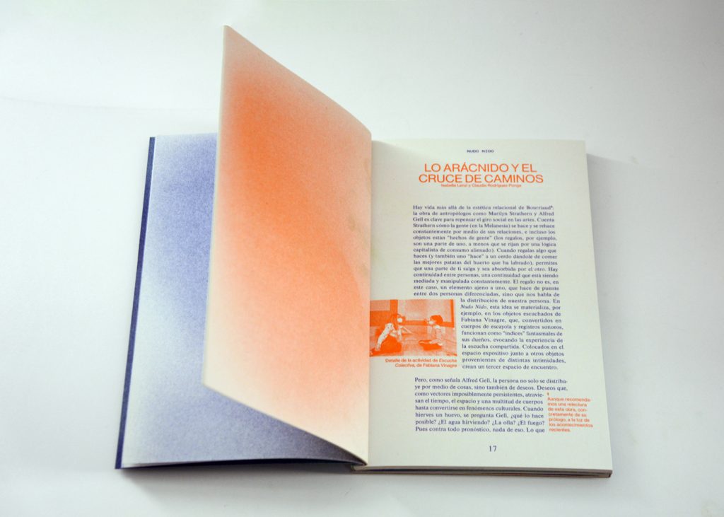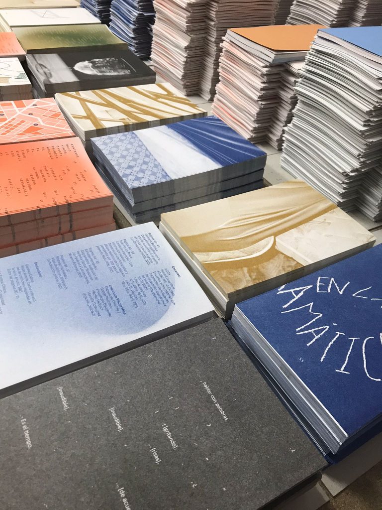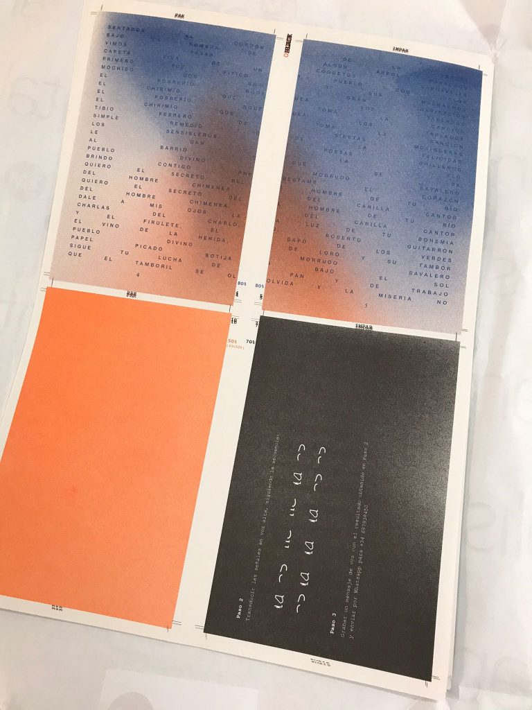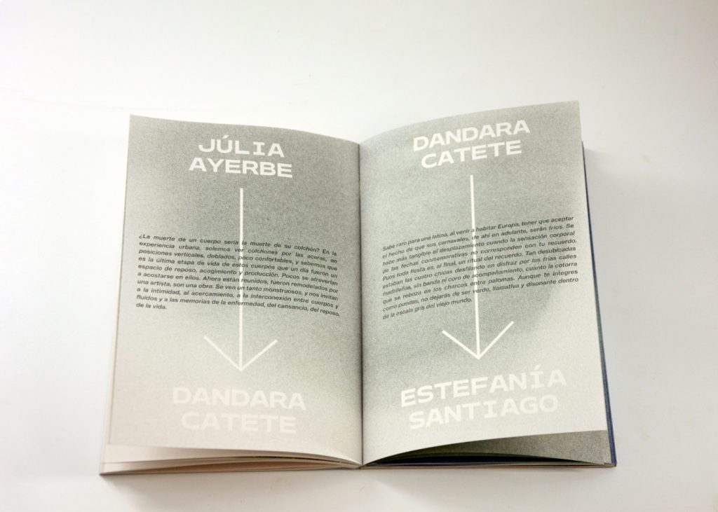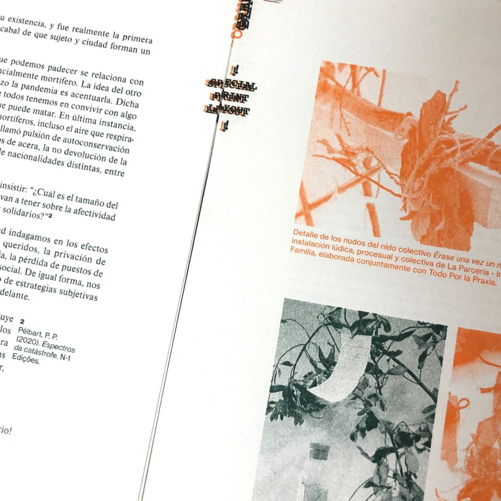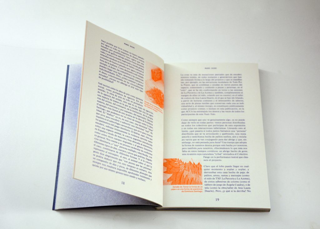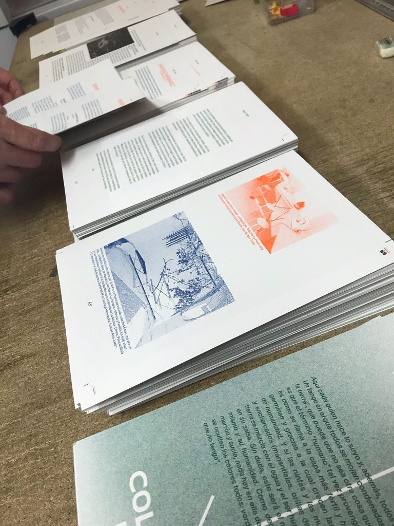 Staying true to the concept of this cooperative exhibition, part of this editorial challenge was to develop a publication that truly engaged with the artist’s and participant groups in a creative and collaborative way. We decided to do the whole book in a printing technique that allowed for hands on plastic exploration while also making it possible to have a small print run. Together with the publishing, printing and bookbinding studio Cabeza de Chorlito, in Madrid, the book was entirely developed and manually assembled through risograph printing process, by combining 4 direct colours (Blue, Green, Orange and Black). This result is a truly unique book, with 60 pages of original visual works, as well as 80 pages of essays and documentation of the whole exhibition programme.