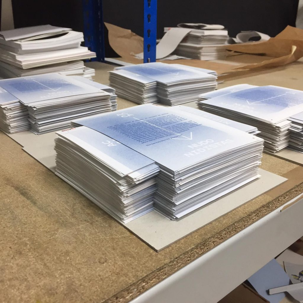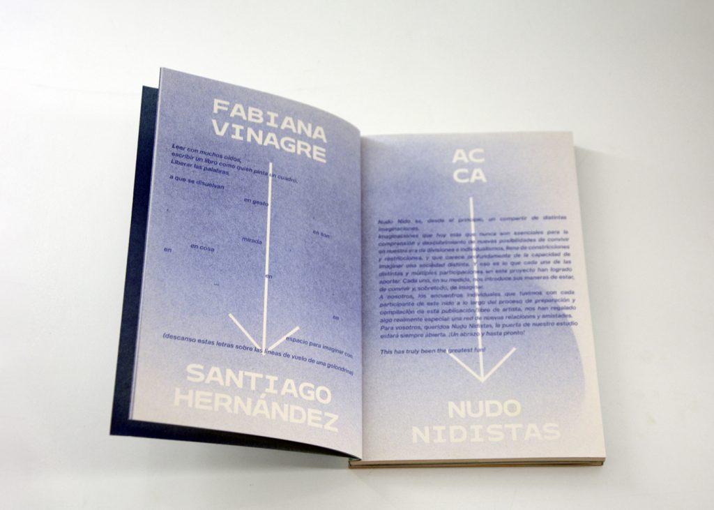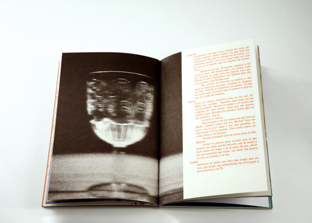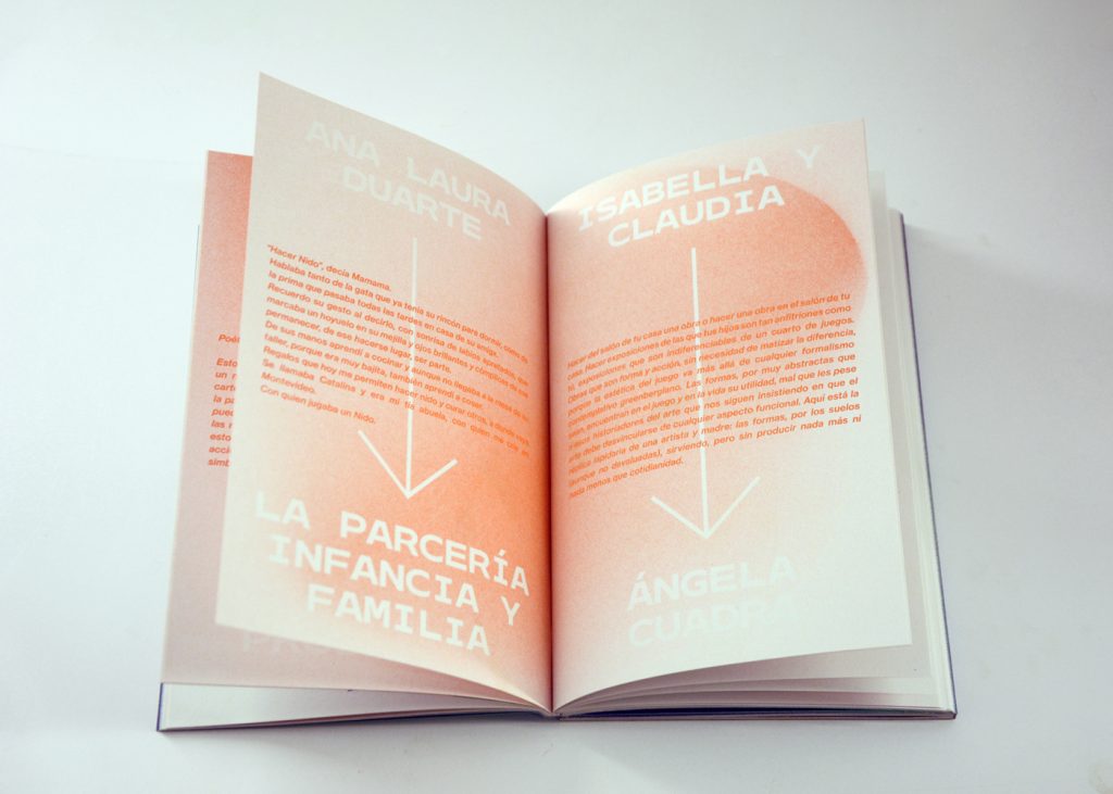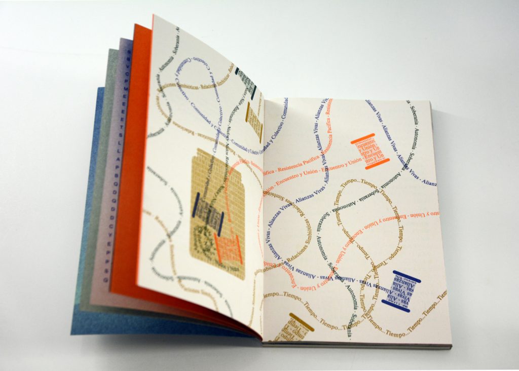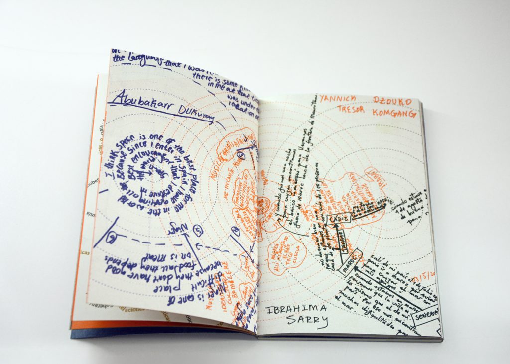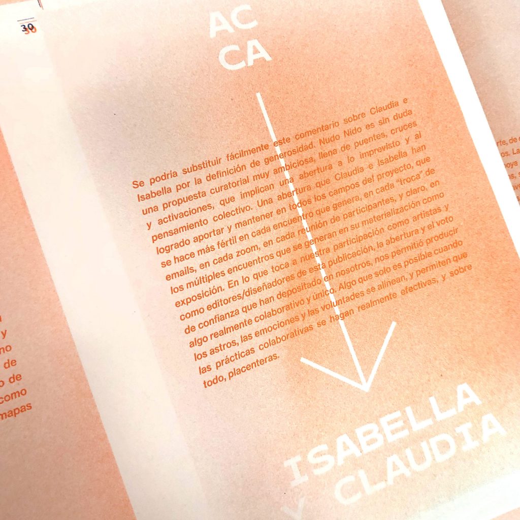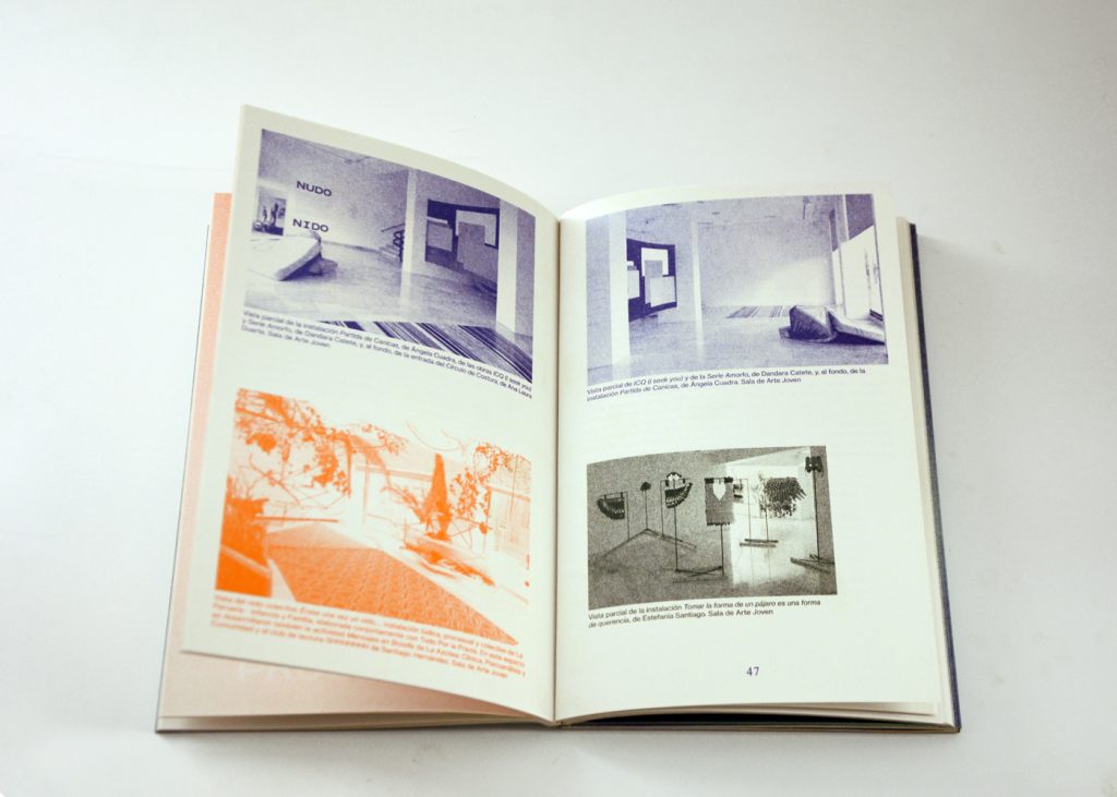 Staying true to the concept of this cooperative exhibition, part of this editorial challenge was to develop a publication that truly engaged with the artist’s and participant groups in a creative and collaborative way. We decided to do the whole book in a printing technique that allowed for hands on plastic exploration while also making it possible to have a small print run. Together with the publishing, printing and bookbinding studio Cabeza de Chorlito, in Madrid, the book was entirely developed and manually assembled through risograph printing process, by combining 4 direct colours (Blue, Green, Orange and Black). This result is a truly unique book, with 60 pages of original visual works, as well as 80 pages of essays and documentation of the whole exhibition programme.